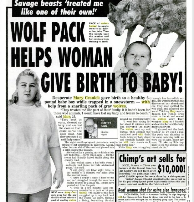 Americká žena Mary Kranik byla chycena ve sněhové bouři, ale porodila zdravé dítě o hmotnosti 3,4 kg. Doprovázela ji skupina vlků, kteří jí při porodu pomáhali.