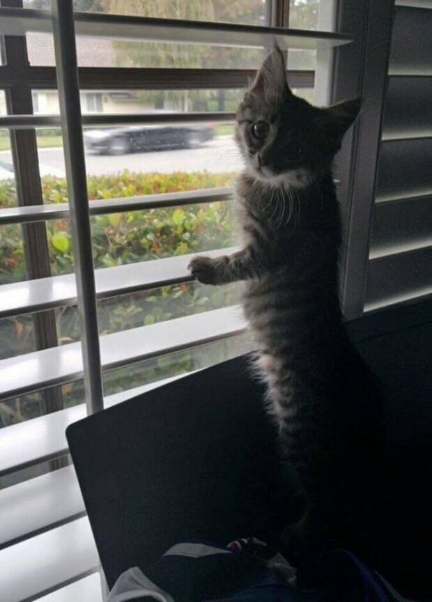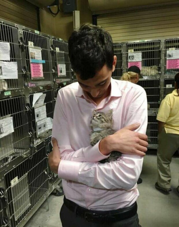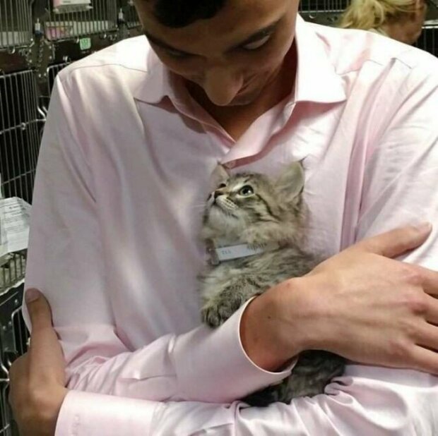 Muž na fotografii vypadá jako velmi milý člověk. Jakmile muž vstoupil do útulku, okamžitě si ho všimla malá kočka jménem Luna.