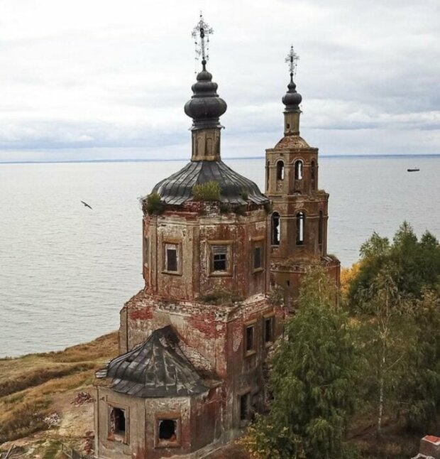Opuštěný kostel na břehu řeky Kama. Republika Tatarstán, Laishevský okres, obec Šuran.