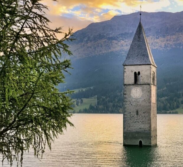 Věž středověkého kostela se tyčí nad jezerem Rezia v Itálii jako památka na několik vesnic zatopených kvůli vytvoření umělého jezera na výrobu elektřiny.