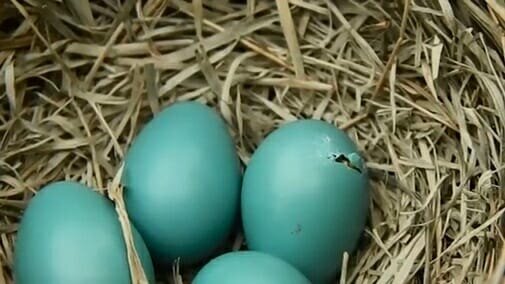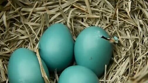 Ve videu vidíme hnízdo stěhovavých drozdů a jejich vejce. Barevné, modré vejce jsou navrženy tak, aby chránily embryo před slunečním zářením.