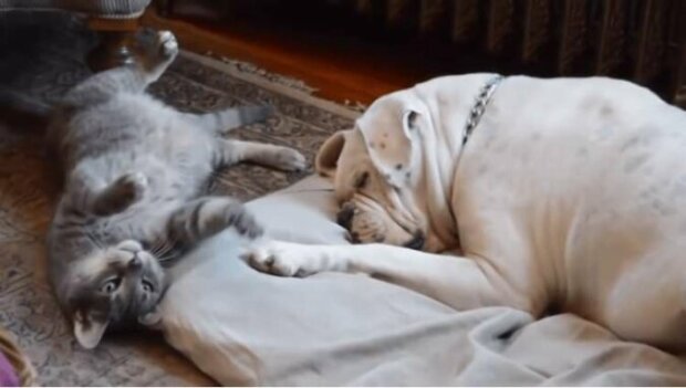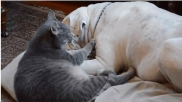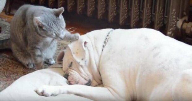 Buď je věkový rozdíl velký, nebo je pes příliš unavený, ale neprobudí se. Kočka mění taktiku…