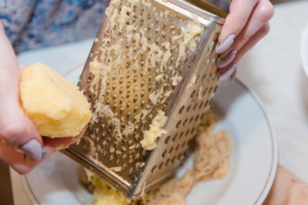 Brambory natřete na drobném struhadle (brambory způsobují, že kotlety jsou daleko šťavňatější).