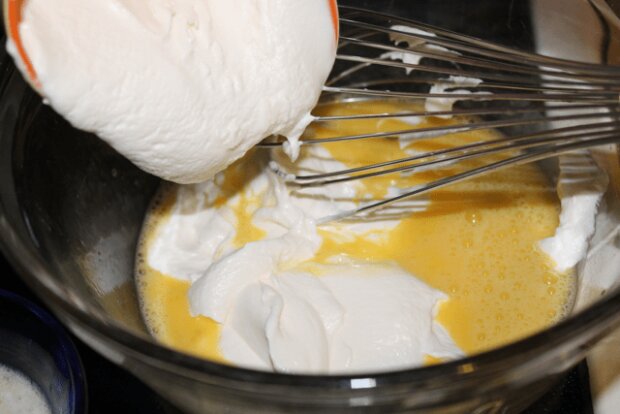 Do vejcí následně přidejte smetanu, tvaroh, roztopené máslo, sodu a sůl.