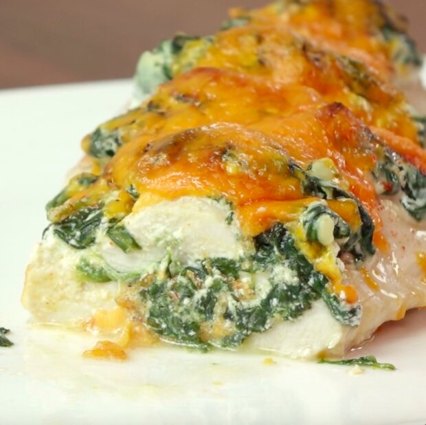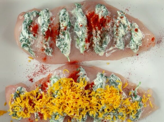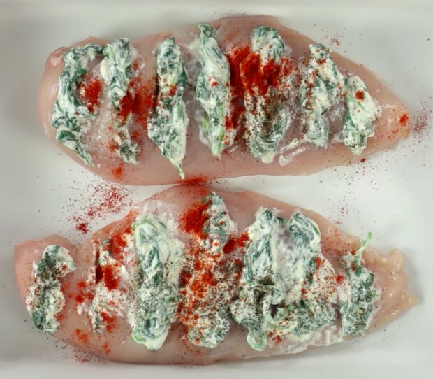 Budou to kuřecí prsíčka ve stylu Hasselback - plněná špenátem a sýrem. Vypadá to fenomenálně, ale ujišťuji vás, že to chutná ještě lépe.