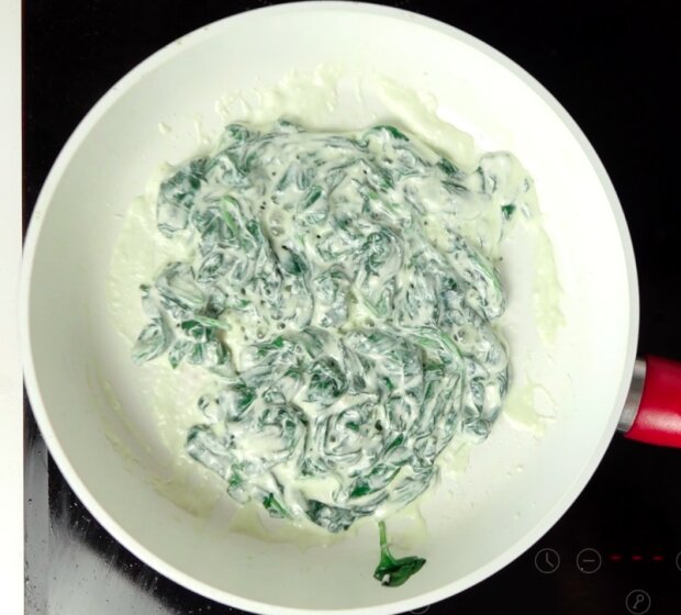 Osmahněte listy špenátu na pánvi. Poté přidejte ricotu a důkladně promíchejte. Chvíli vařte a nechte vychladnout.