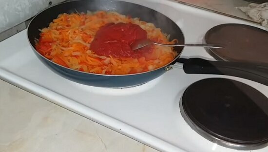 Jemně nakrájejte cibuli a mrkev a smažte na pánvi na oleji. Po 5 minutách přidejte jemně nakrájenou papriku, poté rajčatový koncentrát a důkladně promíchejte. Smažte asi 2 minuty za stálého míchání.