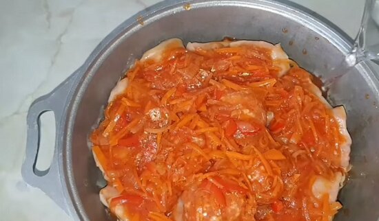 Přidejte polovinu zeleniny k předem připravenému masu a připravte polovinu omáčky. Do pánve nalijte 0,5 litru vody a sůl a pepř. Vařte a poté počkejte, až vychladne.