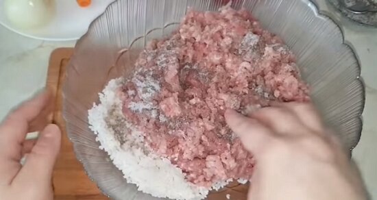 Nalijte vroucí vodu na rýži nebo ji uvařte polotvrdě. Přidejte k tomu mleté maso, sůl a pepř a promíchejte.