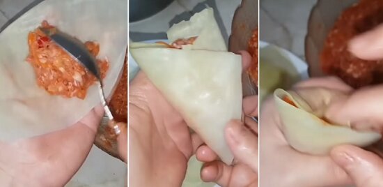 Můžeme začít balit zelí. Naneste nádivku na list a složte jej do trojúhelníku, zabalte horní část listu dovnitř.