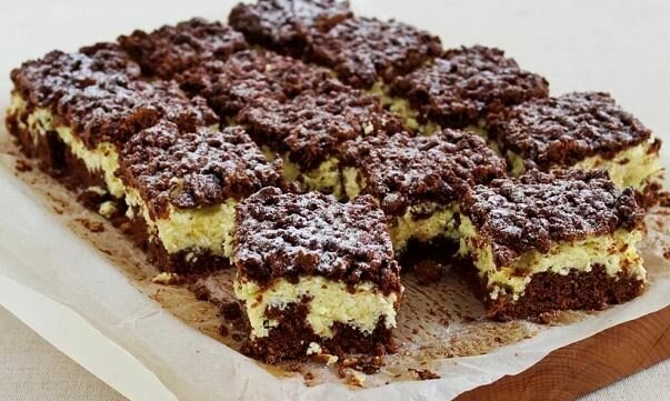 Smíchejte mouku, cukr, máslo, prášek do pečiva, 3 žloutky a kakao. Udělejte hladké těsto, rozdělte na polovinu, zabalte je do fólie a nechte 30 minut vychladnout v lednici. Jemně rozpadněte tvaroh, přidejte 150 g moučkového cukru, žloutku a vanilkového cukru. Zde můžete do tvarohu přidat trochu strouhané citronové kůry pro svěží vůni. Ušlehejte bílky a potom zamíchejte do tvarohu špachtlí. Hluboký plech vyložte pečícím papírem.