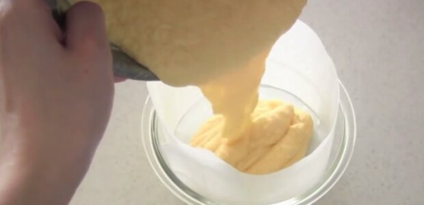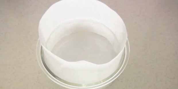 Dortovou formu vymažte máslem a vyložte pečícím papírem, jako na fotografii. Malý tip - protože tvarohový koláč bude pečen ve vodní lázni, stojí za to chránit misku z vnějšku hliníkovou fólií.