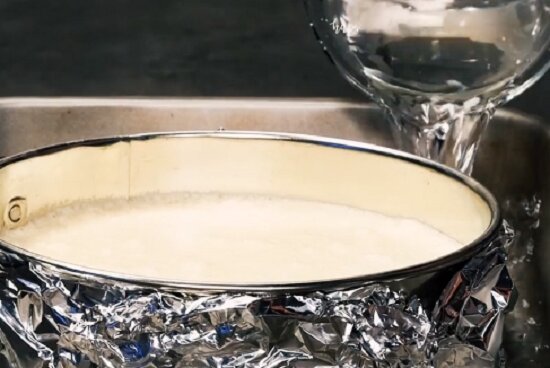 Ve druhé misce rozšlehejte bílé vejce na tuhou pěnu. Pomalu přidejte bílkovou pěnu do tvarohové hmoty a celé jemně promíchejte. Dortová forma (s výřezem asi 20 cm v průměru) se vymaže olejem. Přeneste hmotu do ní a pevně zabalte plech potravinovou fólií. Vložte formu na větší plech a nalijte do ní vodu tak, aby dosáhla 1/3 výšky formy. Vše vložte do trouby předehřáté na 165 stupňů a pečte 50 minut. Po uplynutí této doby troubu vypněte a nechte v ní těsto další hodinu. Před podáváním můžete dort případně posypat moučkovým cukrem.