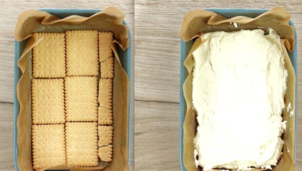 V plechu na pečení lemovaném pečícím papírem rozložte ve vrstvách: máslové sušenky, pudinkové máslo, máslové sušenky, pudinkové máslo, máslové sušenky a pudinková hmota.
