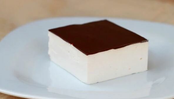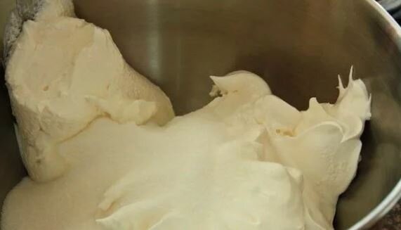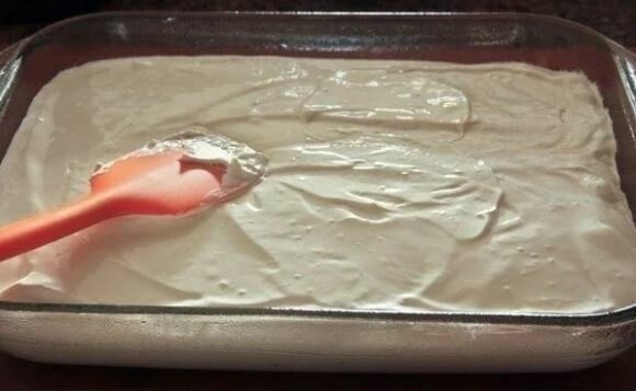 V malém hrnci smíchejte sklenici mléka a želatiny, udržujte ji na nízkém žáru, aby se zahřála, ale nesmíte ji přivést k varu. Vyjměte z tepla, nechte stranou vychladnout. Vymažte plech (20 x 30) vrstvou tuku. Smíchejte zakysanou smetanu s cukrem, přidejte šlehačku. Přidejte lžíci směsi mléka a želatiny za stálého míchání při střední rychlosti.