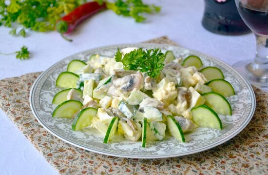 Houby nakrájejte na 4 díly a smažte na másle. Uvařená vejce nakrájejte na větší kousky. Nakrájejte okurky na velké kousky. Vše smíchejte a podle chuti přidejte majonézu s kořením.