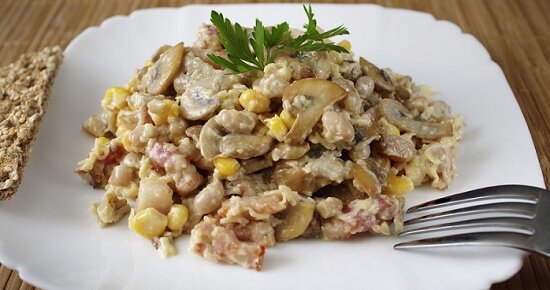 Šunku nakrájejte na proužky, nakrájejte houby, nastrouhejte sýr na struhadle a vytlačte česnek přes lis. Osmažte žampiony a šunku, ale samostatně, smažené ingredience smíchejte s kukuřicí, fazolkami, sýrem a česnekem. Přidejte hořčici a majonézu a své oblíbené koření podle svého vkusu.