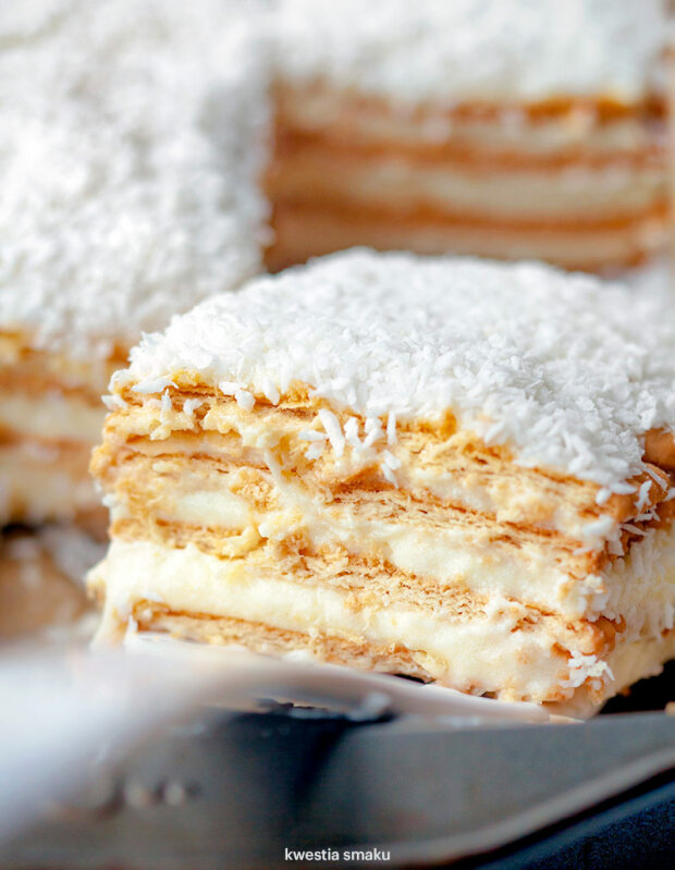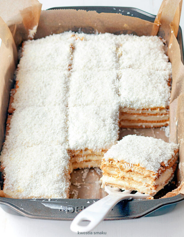 Čtyři vrstvy sušenek vrstvené pudinkovým krémem (z vařeného pudinku se strouhaným máslem) posypané kokosovými vločkami.
