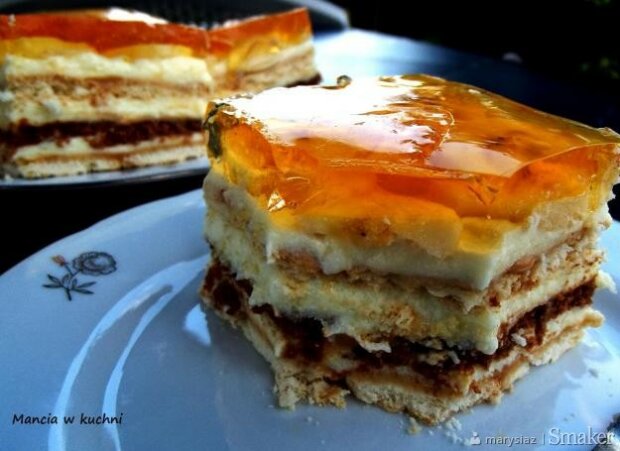 Na vrstvu sušenek jsme vložili 2 polévkové lžíce karamelové hmoty, nalejeme 1 část hmoty, přikryjte tmavými sušenkami, znovu promazejte karamelem, nalíjte další část hmoty a přikryjte poslední vrstvou sušenek, kterou také namažeme karamelem. Vylijeme poslední část hmoty a položíme na ni plátky banánů.
