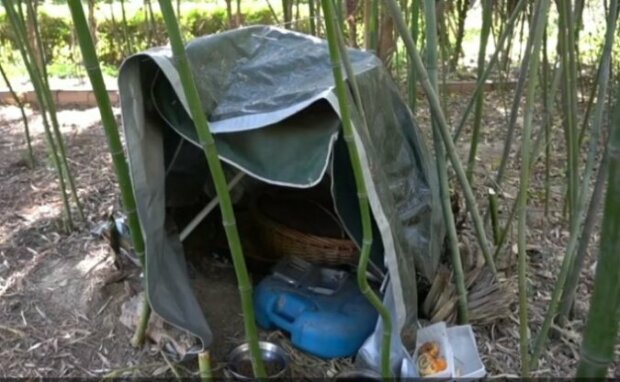 V malém shluku bambusů si obyvatelé postavili malý stan, aby si v něm pes mohl trochu odpočinout. Přinesli mu jídlo.
