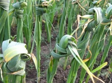 Jakmile jsou listy česneku svázány do uzlíku, rostlina začíná pociťovat stres. Tím se zastaví růst listů a začne odtok živin.
