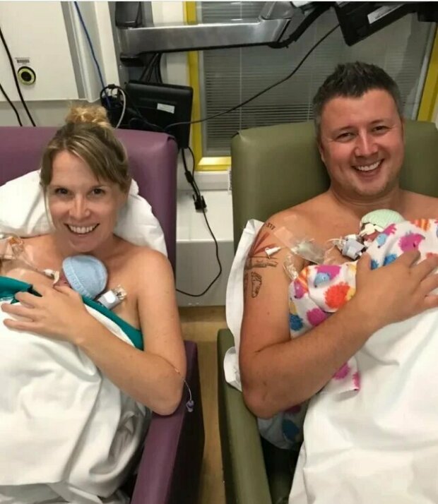 Když už byla Jenny v šestém měsíci, rozhodli se manželé odjet na dovolenou na pobřeží Cornwallu, protože si byli jistí, že se děti narodí za 2-2,5 měsíce, ale osud rozhodl jinak. Žena se již na dovolené necítila dobře a její manžel ji odvezl do nejbližší ordinace praktického lékaře. Po vyšetření lékaři trvali na tom, že Jenny musí být naléhavě převezena na kliniku v Oxfordu, ale vzdálenost 300 kilometrů byla děsivá. Místní úřady souhlasily a o několik minut později přiletěl vrtulník pobřežní hlídky a po 75 minutách byla žena v rukou odborníků a druhý den se stala maminkou.