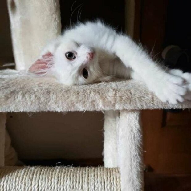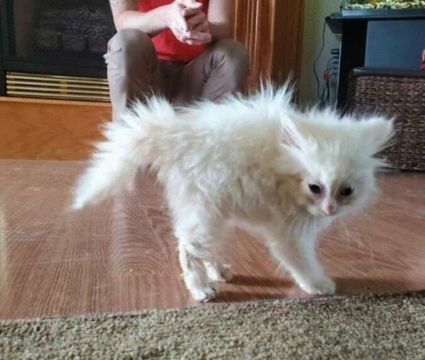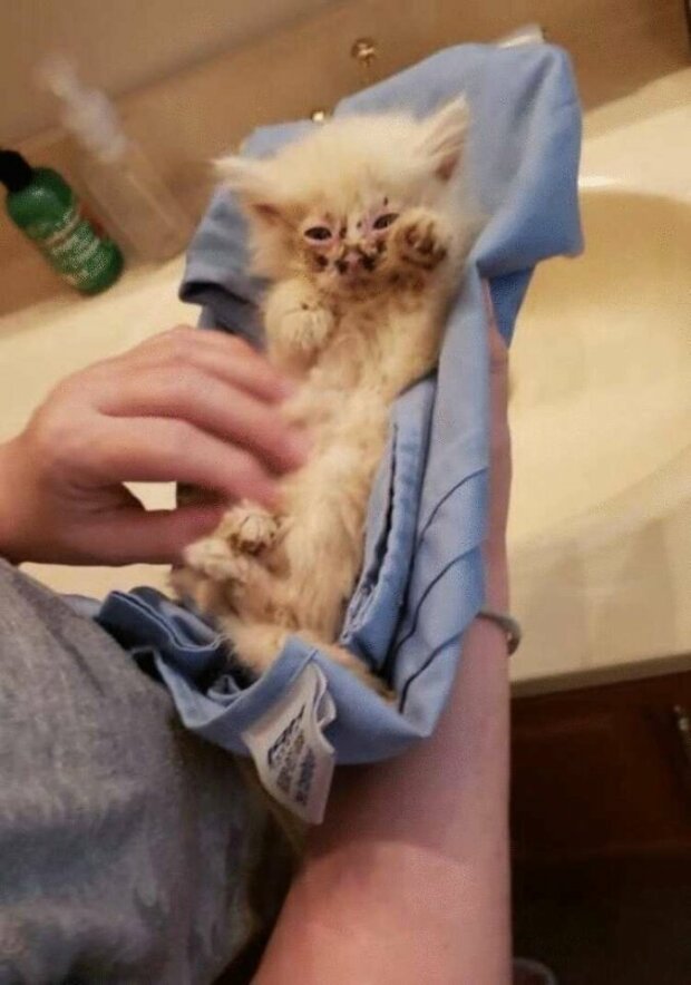 Koťátko bylo umyto a umístěno do blízkosti fénu, aby se trochu vysušilo. Tam kotě téměř okamžitě usnulo. Kotě mělo štěstí, že bylo celé a zdravé. Proto se ho nejprve rozhodli nechat na pokoji, aby si na něj zvykli. A pak ho chtěli představit ostatním obyvatelům domu.