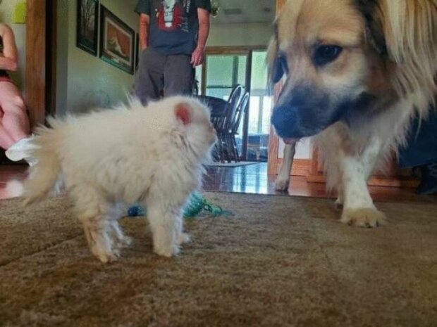 Není jasné, jestli bylo kotě jen trochu rozzlobené, nebo vyděšené? Ale pak přišla Zeta a všechno bylo jasné a srozumitelné. Největší a nejchytřejší pes vzal malého pod svá křídla a kotěti to nevadilo.