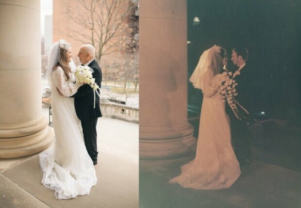 Pár si oblékl svatební šaty, které se po celou dobu dochovaly, a přesně zrekonstruoval fotografie z doby před 50 lety.
