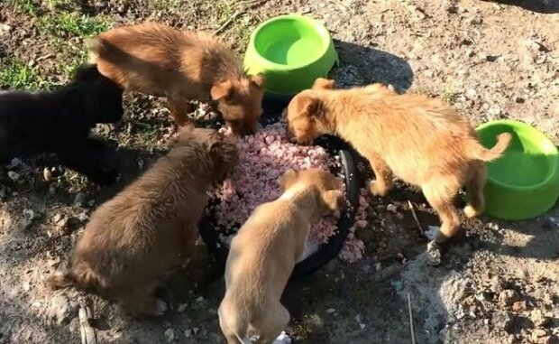 Všichni malí samozřejmě měli hlad, a tak lidé, kteří si to uvědomili, nepřišli s prázdnýma rukama. Nasypali jídlo do velké misky a sledovali, jak ho štěňata kousek po kousku polykají. Nějak se jich našlo dost pro všechny, i když dobrovolníci doufali, že se jim podaří zachránit jen jedno malé dítě, ne celou čtyřnohou "rodinu"!