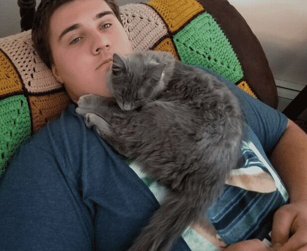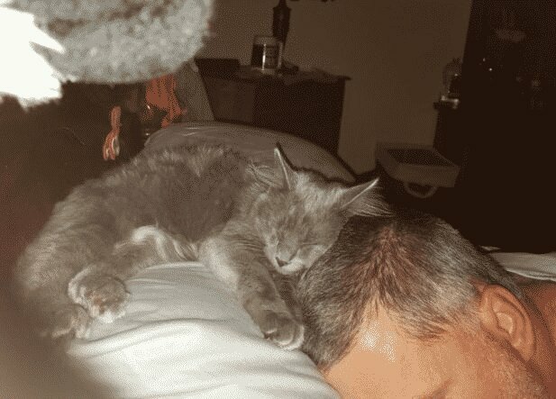 Jednou z jeho oblíbených činností je sedět na rameni svého pěstouna. Kocour mu chce dělat společnost po celou dobu - zřejmě mu tak děkuje za záchranu.