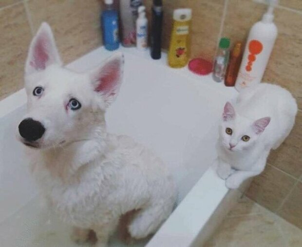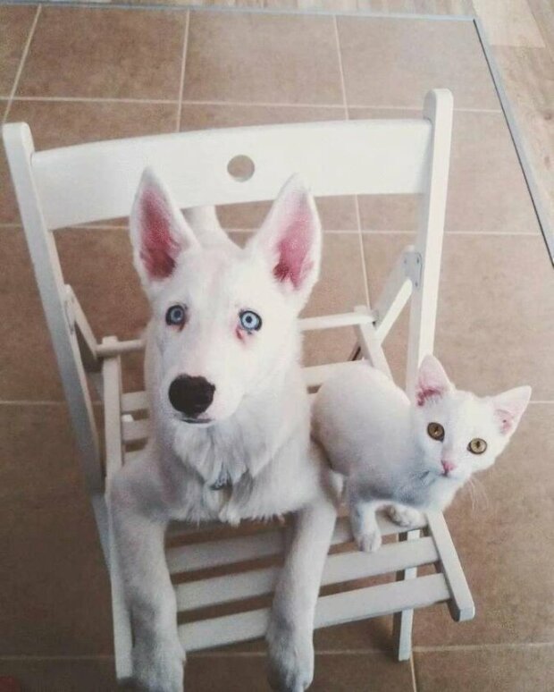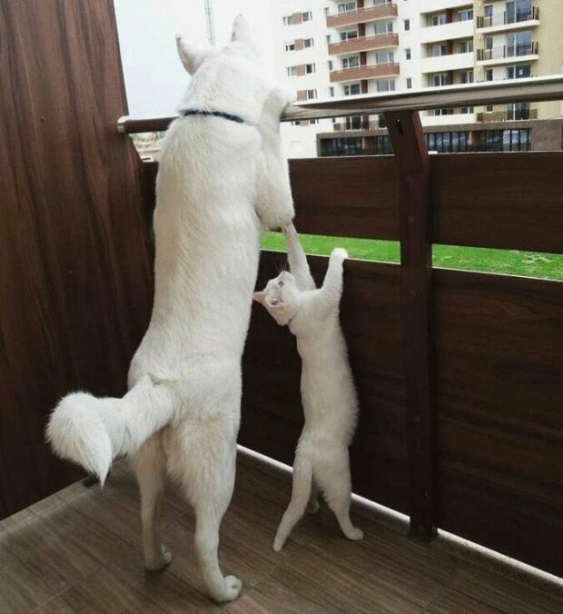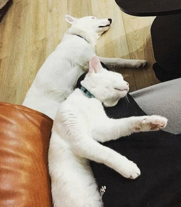 Hrají si s hračkami, sedí a spí na jednom místě. Pokud kotě usne v náručí majitele, štěně se tam doplazí také. Přes den dělají všechno společně, dokud nejdou spát.