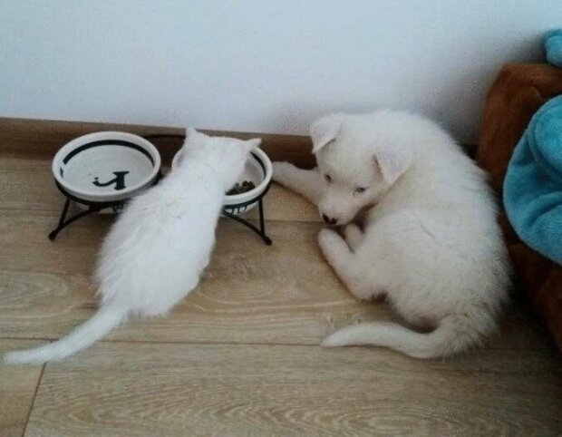 Druhý den byli noví přátelé opatrní, ale jejich zájem o sebe navzájem nezmizel. Pak začali pít vodu ze stejné misky. Kotě naučilo štěně pít a jíst z misky.