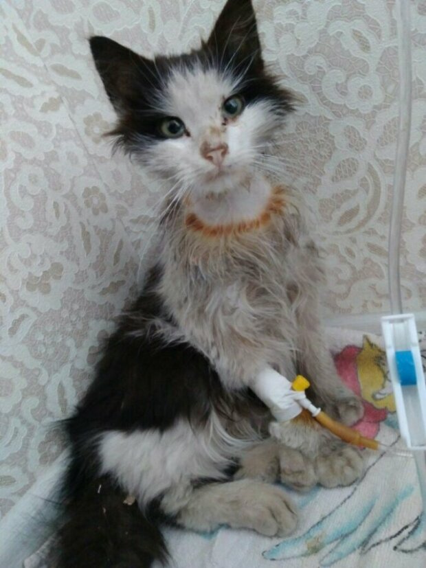 Kotě bylo vyšetřeno na veterinární klinice. Měl nízkou teplotu, byl dehydrovaný a strašně vyčerpaný. Výsledky krevních testů byly velmi špatné. Koťátku byly předepsány hřejivé polštářky a kapačky. O dva dny později se teplota kotěte zvýšila na 42 stupňů. Byl stále velmi slabý a odmítal jíst. Dívka chudáka koťátko sama napojila na kapačku, protože s ním nemohla dál chodit na veterinární kliniku. Dokonce se v noci budila, aby kotěti podala léky. Dítě jí celou dobu leželo v náručí a vrnělo. Bylo zřejmé, že se kotě zotavuje a děkuje tak své zachránkyni za péči.