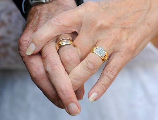 Pár se také rozhodl „aktualizovat“ své snubní prsteny ... U příležitosti zlatého výročí jsou ozdobeni dalšími zlatými srdíčky.