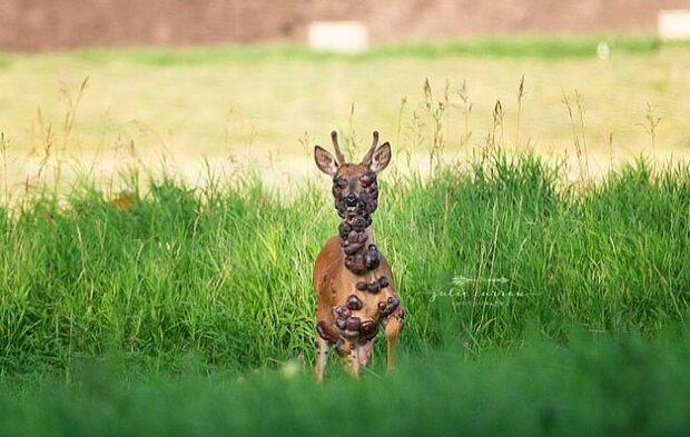 Fotografce se podařilo zachytit nemocného jelena na obrázcích. Zvíře je pokryto tolika hrboly, že ani nevidíte jeho oči. Rány jsou na obličeji, krku, hrudi, žaludku, nohou a zadní části těla.