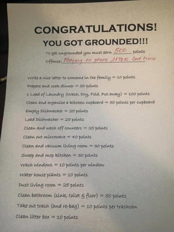 Žena pověsila na lednici kartu informující děti, že dostali bariéru. Získání 500 bodů bylo jedinou možností, jak trest zrušit. Nebyl to však jednoduchý úkol. Zde můžete získat body: