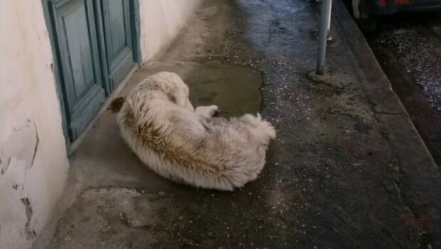 Tento dojemný příběh se stal v Řecku. Obyvatelé tohoto města si všimli velkého psa na ulici, který sotva putoval po vedlejší ulici. Bylo jasné, že pes potřebuje pomoc, protože byl úplně vyčerpaný. Skutečnost, že byl zraněn, ho přiměla padnout vedle nedalekého domu a jen zavřel oči. Lidé si všimli chudého pejska a okamžitě kontaktovali dobrovolníky.