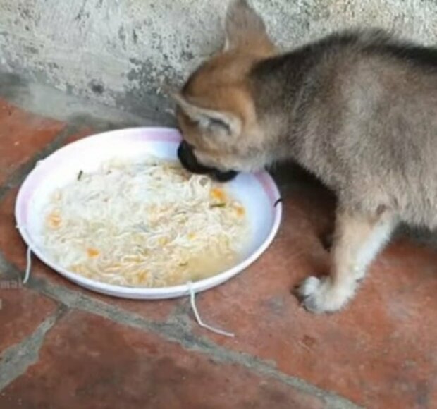 Muž odnesl štěně domů. Později řekl že toho malého krmil těstovinami. Zjevně to pes měl rád, i když to nebylo jídlo, na které byl zvyklý.
