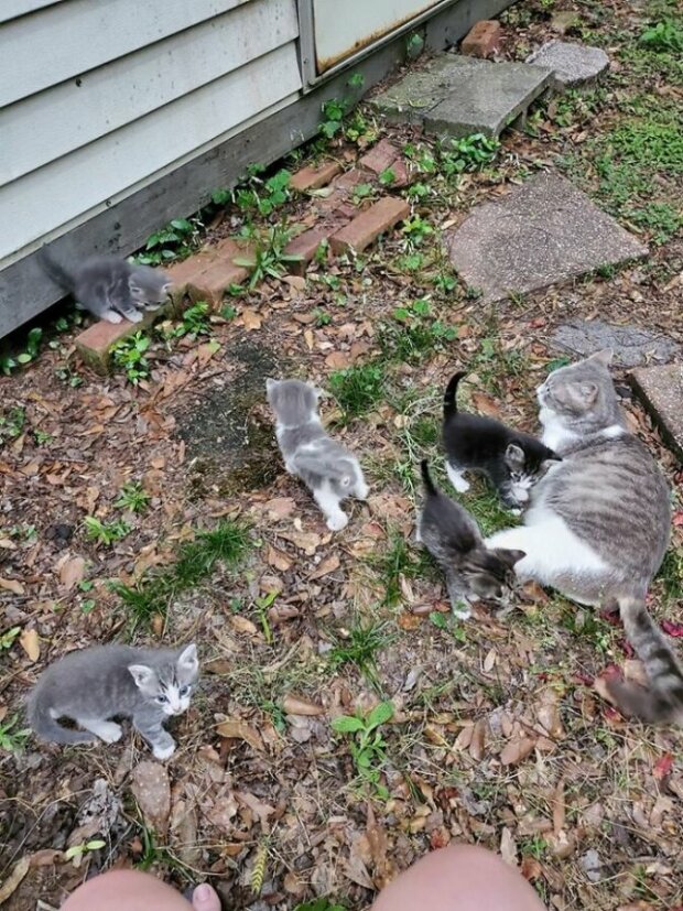 O dva dny později se šedá krása vrátila s načechranými koťaty!
