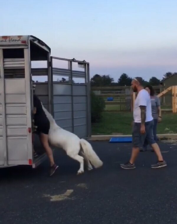 V den jejich adopce přivezli Maddie a Nick koňský přívěs a připravili na něj naložit poníka. Ukázalo se, že to není nutné - Waffle viděl svého přítele jít dovnitř a skočil za ním!