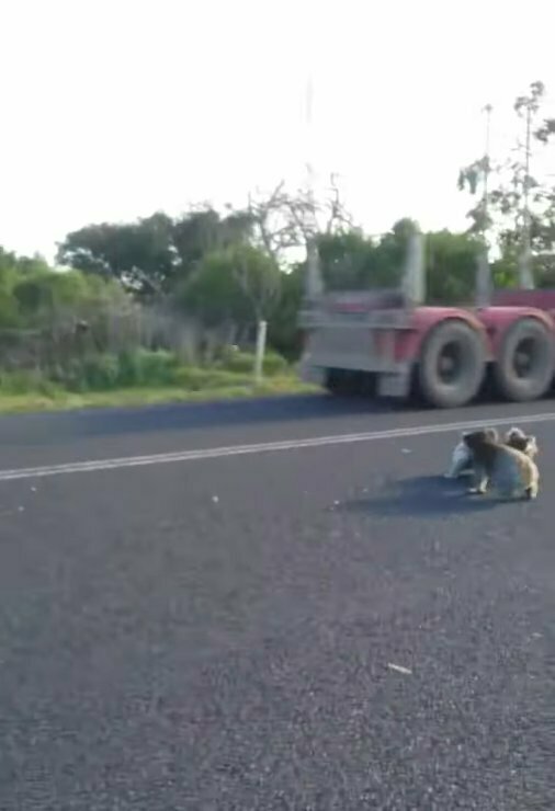 Sharon znovu přistoupila ke koalám a pokusila se je odtáhnout, což se jí povedlo, takže nakonec odešli někam dále od silnice.
