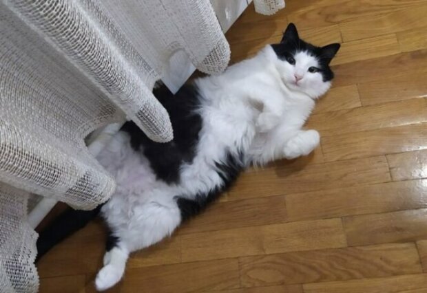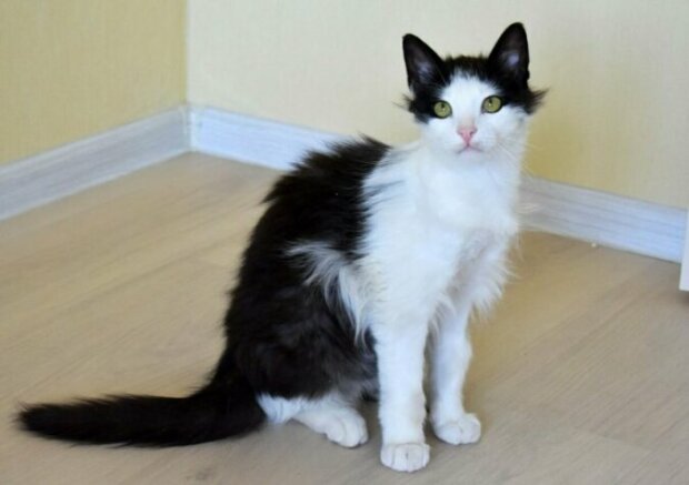 Jednoho květnového dne si dobrovolníce všimla kotěte ležícího u dveří supermarketu. Byl celý špinavý topným olejem, špinavou srst, krk oholený a na něm stopy jódu. Zřejmě se někdo snažil uzdravit toto kotě. Dívka před něj položila jídlo, ale kotě to jen oňuchalo a nedotklo se ho. Potom vyšla uklízečka z obchodu a začala koťátko odhánět koštětem. Malý se pomalu postavil, trochu se vzdálil a znovu spadl na stranu. Dobrovolníce si uvědomila, že kotě je zjevně nemocné, protože neutekl ani před koštětem.