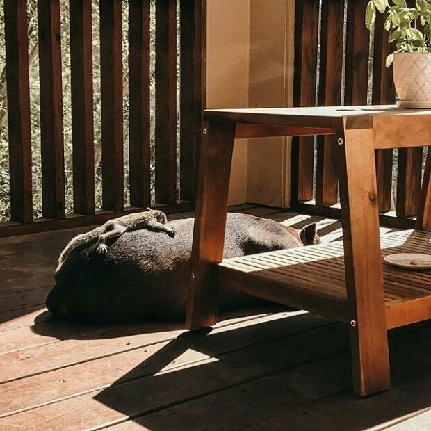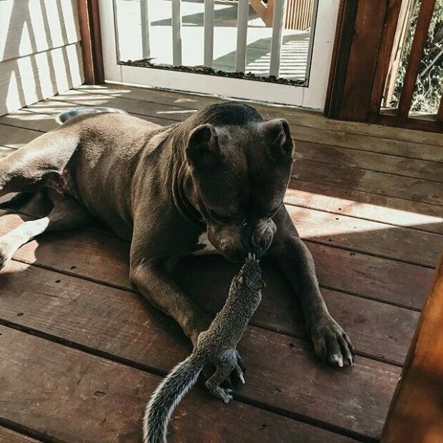 Everly neopustila svého chlupatého přítele. Kdysi bojový pes, který nyní propůjčuje záda jako polštář pro malou veverku.