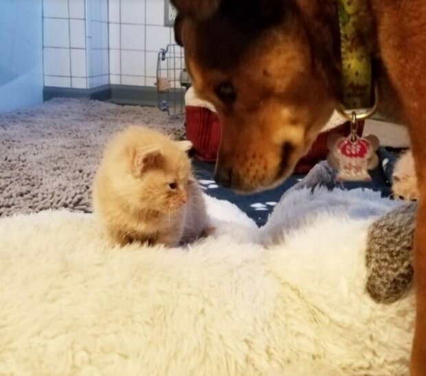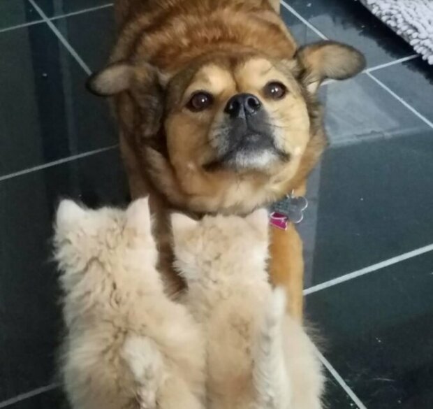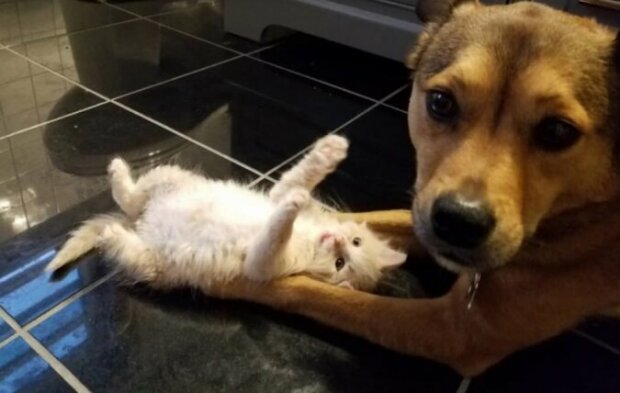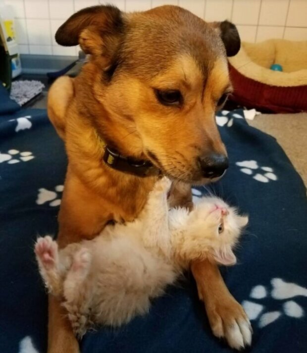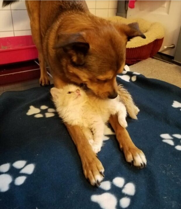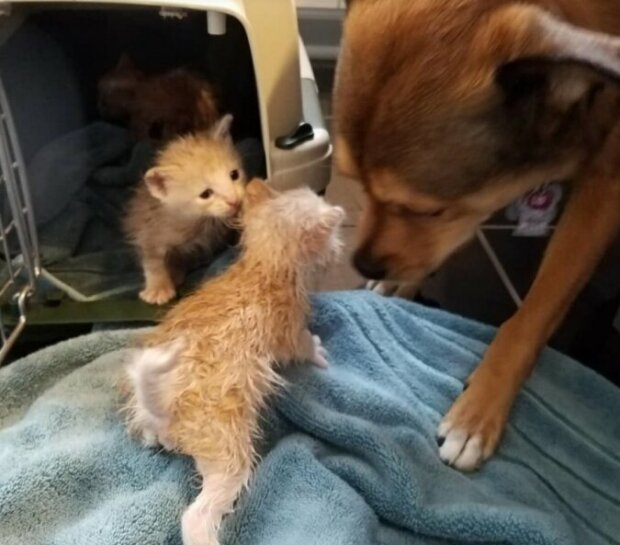 Pes se o koťata postaral - jsou s ním v naprostém bezpečí, dokud pro ně majitel nenajde trvalé rodiny.