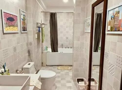 WC a koupelna jsou propojené. Rozhodli se vyzdobit tuto místnost v jemných bílých barvách. Renovace proběhla v souladu s moderními standardy. Pro tak velkou rodinu může kombinace toalety a koupelny způsobit určité nepříjemnosti. Například když se jeden člen rodiny sprchuje, jiný možná bude muset použít toaletu.