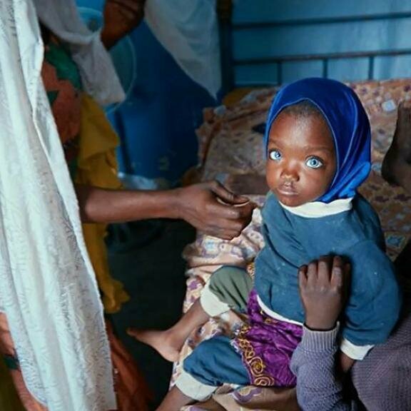 Když se Risikat narodial, rodiče zpočátku nevěřili, že to byla jejich dcera. Faktem je, že dítě, které se objevilo v páru hnědých očí s tmavou pletí, mělo neobvyklou barvu očí: její duhovky nebyly tmavé jako všech Nigerijců, ale světle modré. Otec a matka se toho obávali a mysleli si, že jejich dcera je nemocná, ale po mnoha testech se ukázalo, že zdraví dívky bylo v pořádku.