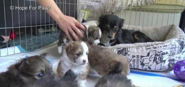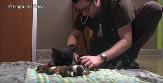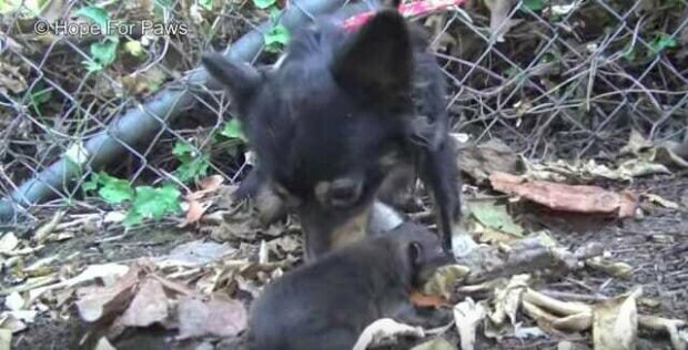Chlapci vzali štěňata domů a tam si uvědomili, že děti potřebují zvláštní péči. Rodiče zavolali organizaci Hope for Paws. A když tým dorazil, vrátili se na stavbu, protože se tam možná objevila matka štěňat. A byla tam!